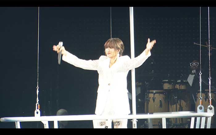 A-Lin給的驚喜還未結束,第二首歌她便立刻換上一身白色西裝,再次於空中身起,唱著經典歌曲《一直走》,從後方緩緩向著舞台前進,即便吊台不斷微微搖晃,A-Lin的歌聲仍十分穩,爆發力十足,不愧是能唱進人心的天生歌姬!正當A-Lin高歌時,空中還飄下無數「小飛機」,增添現場氣氛,而A-Lin也提到,這些用保麗龍打造的小飛機,是遠赴日本製作,一晚降落的小飛機就要價三十萬元!A-Lin寵粉技能點滿,現場觀眾超幸福!
