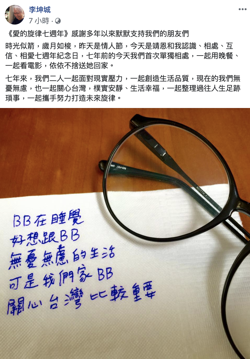 李坤城15日特別在臉書發了一則貼文寫道,「感謝多年以來默默支持我們的朋友們,昨天是情人節,今天是靖恩跟我認識、相處、互信、相愛七週年紀念日,七年前的今天我們首次單獨相處,一起用晚餐、一起看電影,依依不捨送她回家。七年來,我們一起面對現實壓力,一起創造生活品質,現在的我們無憂無慮,也一起關心台灣,樸實安靜、幸福生活,一起整理過往人生足跡瑣事,一起攜手努力打造未來!」