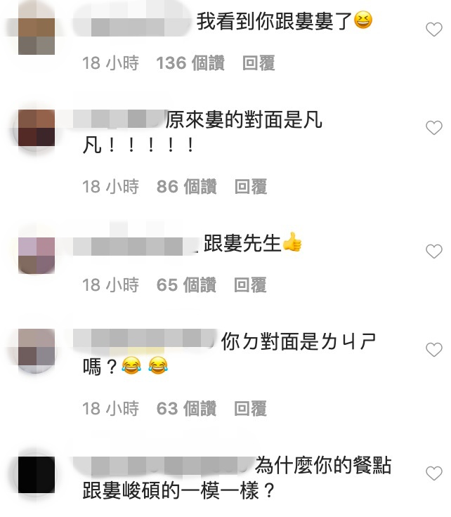 凡凡照片一出,除了網紅好友們紛紛前來留言以外,也有不少粉絲表示,「我看到你跟婁婁了」、「原來婁的對面是凡凡」、「對面是ㄌㄐㄕ嗎?」、「為什麼你的餐點跟婁峻碩的一模一樣?」、「隔空放閃好羨慕喔⋯」、「低調放閃!」。