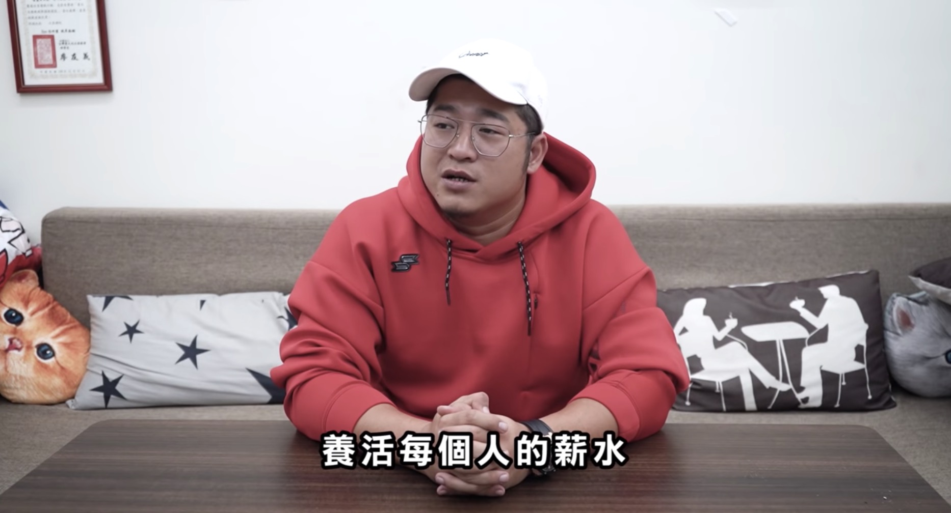草爺表示,狂人娛樂公司抽成方式為「公司六成、創作者四成」,拿到分成後扣掉一些成本,完全不夠支出自己團隊的開銷、員工們的薪水。外面的行情卻大不相同,草爺提到,外頭行情「創作者八成、公司二成」,若是以靠公司栽培的素人來說,狂人娛樂的方式合理,不過草爺認為自己算是「帶槍投靠」,被抽六成實在很傷,也因此養不活員工,就連商案最多的幾個月都仍入不敷出。