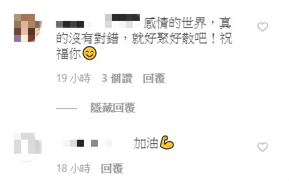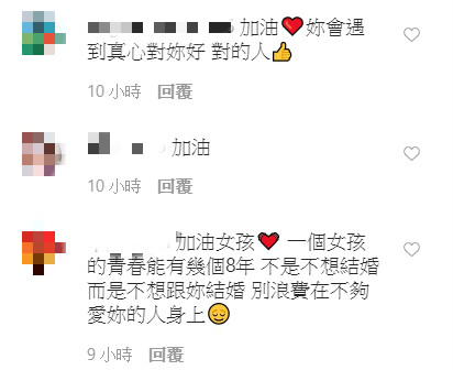 不少網友湧入底下留言,鼓勵「加油,妳會遇到真心對妳好、對的人」、「加油女孩,一個女孩的青春能有幾個8年,不是不想結婚而是不想跟妳結婚,別浪費在不夠愛妳的人身上」、「感情的世界,真的沒有對錯,就好聚好散吧!祝福你」,同時也有不少網友質疑她在炒新聞,對此她回應「事情的真相只有當事者最清楚,之後我不也會針對前任有任何的發言,謝謝大家」。