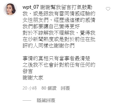對此前女友Jessie在IG上發文自曝感情內幕,表示「8年的感情有體諒、有忍耐、有深愛,始終當著你背後的那個人,到感情的最後還是希望你一切都好,只乞求你不要再傷害我」,坦言「但到最後你還是沒有遵守你給我的承諾,誠實面對自己內心,不傷害你曾經愛過的人,至少要做到…」,最後感謝大家的關心,感慨表示「只盼無需再有任何交集、彼此安好」。