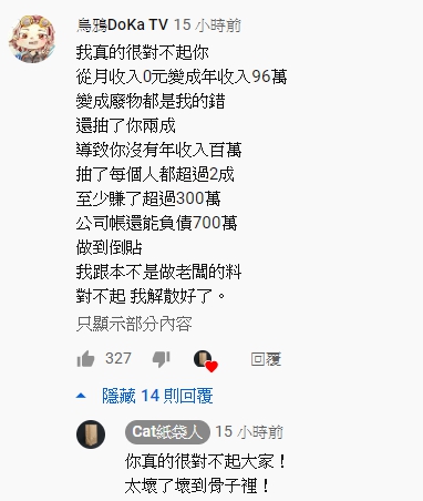 紙袋人影片一出,引來大批網友觀看,紛紛刷留言「好想被惡棍剝削」!而惡棍老闆「烏鴉」也現身回覆,「我真的很對不起你,從月收入0元變成年收入96萬,變成廢物都是我的錯!」另外烏鴉也指出,雖然抽了每個創作者2成,只少賺了300萬,但公司能負債700萬,直呼自己不是做老闆的料,「對不起,我解散好了」。
