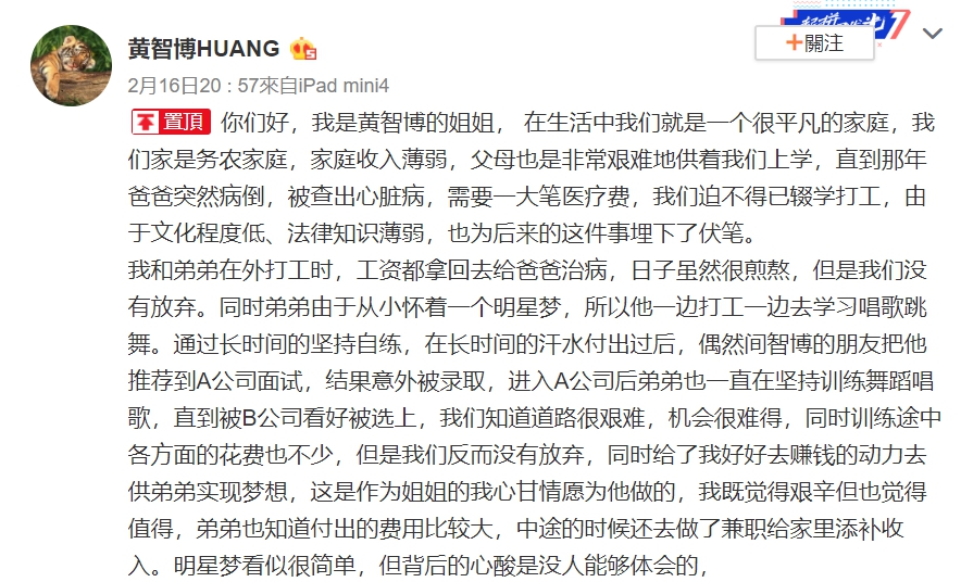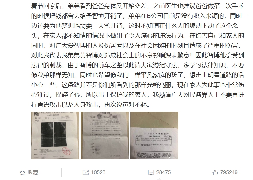 然而春節回家後,黃智博發現爸爸的身體又再度變差,同時因為家裡把爸爸做手術的錢都用來供他實現夢想,由於他目前還是練習生階段沒有收入來源,同時在訓練過程中仍舊需要大筆開銷,在家庭與夢想雙重夾擊下,「不知道在什麼人的煽動下動了這個念頭,在家人都不知情的情況下做出了令人痛心的違法行為」。姊姊語重心長表示,「由於弟弟的前車之鑑,以此請大家遵紀守法,多學習法律知識,不要像我弟那樣無知」,同時也呼籲「同樣平凡家庭的孩子」,「想走上明星道路的話小心一些,這條路並不是你們所看到的那樣光鮮亮麗。」