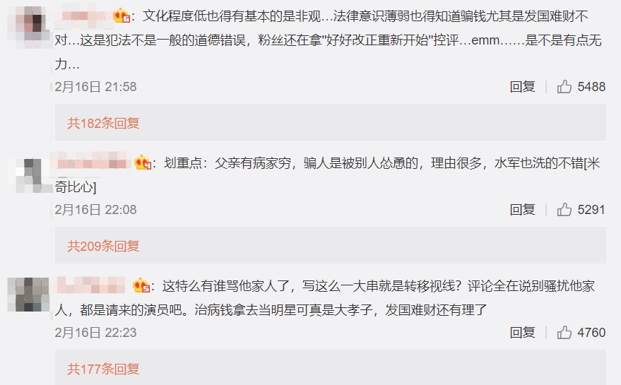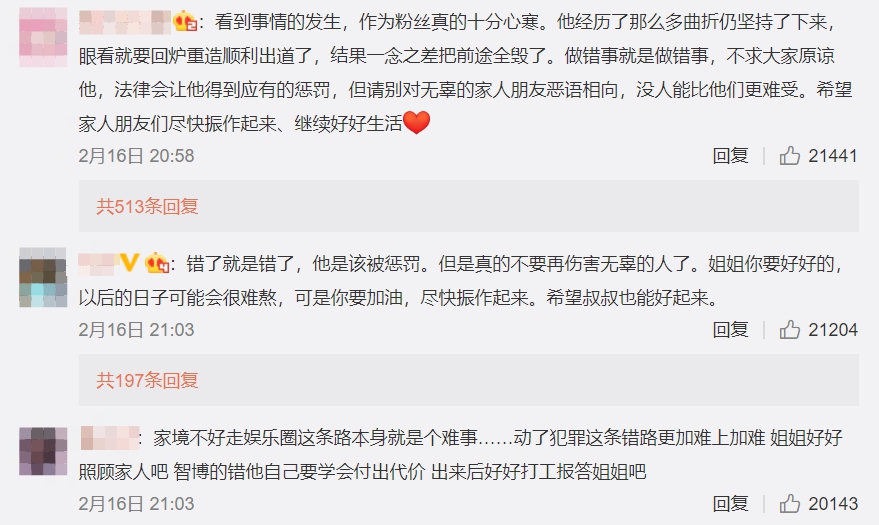 黃智博姊姊的發文一出,再度引起熱議,有些網友對姐姐相當心疼,「姐姐好好照顧家人吧,智博的錯他自己要學會付出代價,出來後好好打工報答姐姐吧。」、「姐姐你要好好的,以後的日子可能會很難熬,可是你要加油,儘快振作起來。希望叔叔也能好起來。」然而大部分網友仍舊不買帳,紛紛表示:「詐騙都是被別人慫恿的。感情全是別人的錯,成年人了什麼該做什麼不該做不知道嗎?不念書還不上網嗎?」、「這算是發國難財吧。我覺得沒什麼值得原諒的。」、「你他媽家裡有問題就是騙錢的理由了?」、「我覺得這不是人做壞事的理由啊,而且他騙的錢也是別人的血汗錢,怎麼就他掙錢困難呢,大家都一樣啊。」