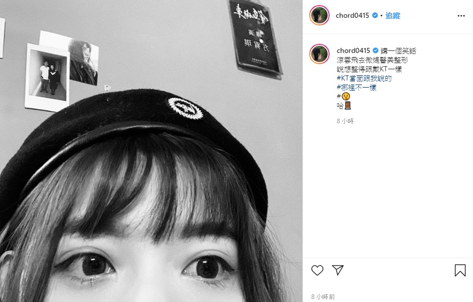 謝和弦最近除了忙著處理跟KT的官司以及幫莉婭出單曲之外,還有持續更新他的社群平台,還在IG中貼文爆料說,「講一個笑話,涼雲飛去微媞醫美整形,說想整得跟戴KT一樣!」還hashtag「#KT當面跟我說的 #哪裡不一樣」意圖想要讓大家認為這是KT爆的料,想要讓KT跟梁云菲兩人的感情變不好!