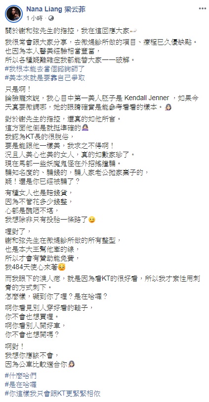 而梁云菲看到了謝和弦的爆料之後,也在自己的臉書發文反擊說,「我很常會跟大家分享,去微媞診所做的項目、療程已久優缺點。也因為本人醫美經驗相當豐富,所以各種疑難雜症我都能替大家一一破解。只是啊!論臉龐來說,我心目中第一美人胚子是 Kendall Jenner,真要微調,她的眼睛的確是範本!」並提到「謝先生的指控,倒是挺準確,KT長得很脫俗,要是能跟她一樣美,我求之不得!」