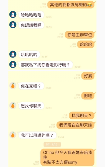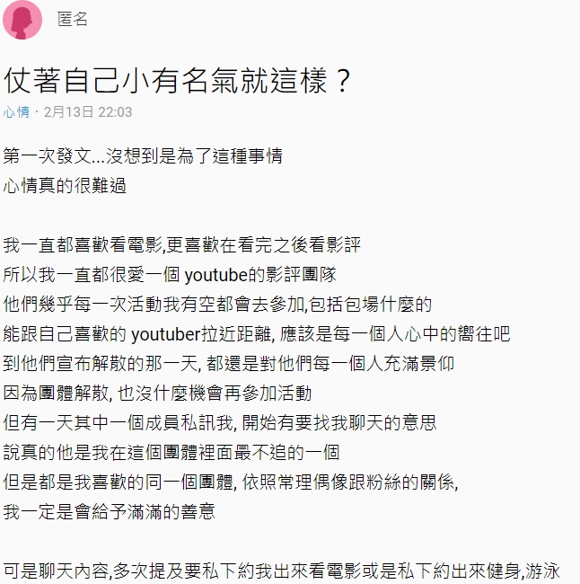 日前有網友在「Dcard」上發文表示,自己非常喜歡某一個YouTube影評團隊,只要有活動就會去參加,就在某一日,其中一個成員突然私訊聊天,且多次表達想約出去的意思,除此之外還會不斷傳來「我現在單身,需要陪伴」、「我需要有人在身旁支持我」、「我在哭」等令人不知所措的訊息,這些對話也持續到一次的電影包場活動。
