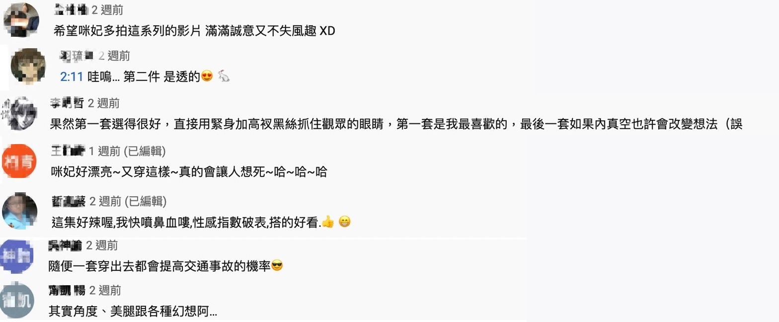 然而網友們看見咪妃誠意開箱5件大尺度旗袍後,也紛紛在留言區讚嘆:「哇嗚… 第二件 是透的」、「咪妃好漂亮~又穿這樣~真的會讓人想死」、「隨便一套穿出去都會提高交通事故的機率」、「這集好辣喔,我快噴鼻血」,獲得廣大的好評。