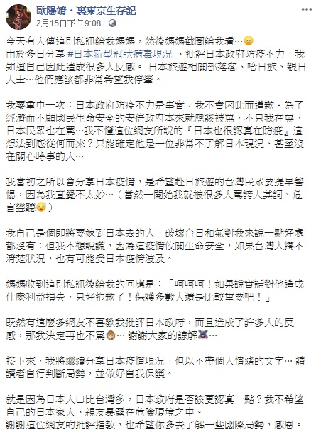 女星歐陽靖旅居東京,剛好最近碰上了武漢肺炎的事情,讓她特別關注日本當地疫情的狀況,她先前就曾在臉書痛批「日本防疫措施不足!」引起了許多網友們關注與討論,也有不少網友對她這樣的行為感到不滿,跑去私訊她媽媽,希望歐陽靖可以停止再繼續發表武漢肺炎相關的言論,她看完之後也給了超霸氣的回應!