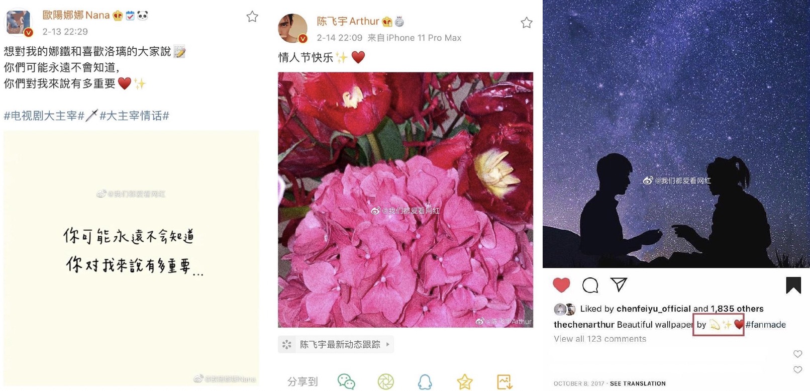 近期又有眼尖的網友發現歐陽娜娜和陳飛宇在微博上有著相同的巧合,在13號時歐陽娜娜發文寫下:「想對我的娜鐵和喜歡洛璃的大家說,你們可能永遠不會知道,你們對我來說有多重要」,在文末處也附上了一個愛心以及閃亮的表情符號,而陳飛宇14號時先在微博上發文「情人節快樂」,同樣也附上愛心與閃亮的符號,接著更有眼尖的網友翻出他在2017年時就曾出現過這兩個符號,知名娛樂博主也發文說道:「歐陽娜娜跟陳飛宇又在暗戳戳發糖了,兩人一前一後用的emoji都一樣」,引起熱議。