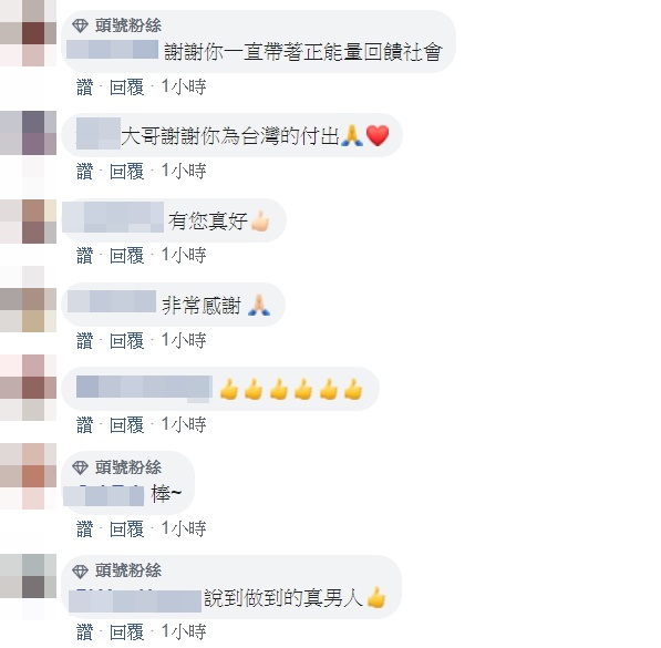 486先生貼文一出,不到幾個小時就湧進上萬讚,同時有1千多名網友留言,「取之於社會,用之於社會。說大哥為當世之楷模也不為過,您讓我太敬佩了!」、「國難當頭共體時艱!」、「身為台灣人以你為榮」、「真棒!有錢出錢,有力出力,大家一起把防疫做好」、「國家的好棟樑我欣賞你」、「比只會說捐口罩罵狗官的人好多了」。