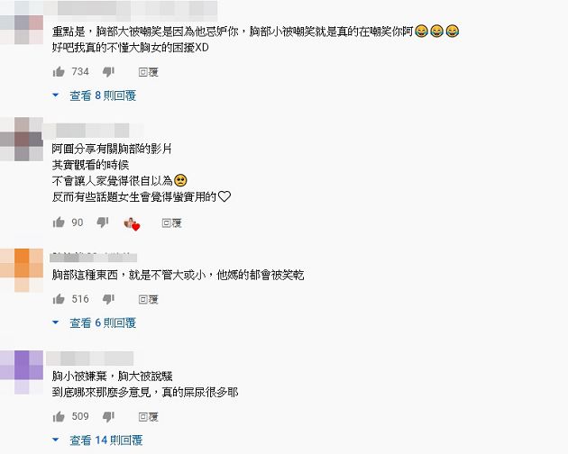 阿圓影片一出,立刻引起廣大討論,網友們紛紛留言表示,「終於有人用客觀的方法說這種題材了」、「最大的困擾...就是內衣真的有夠醜」、「胸部大有時候真的很崩潰,尤其是睡覺絕對不能趴睡,很像快窒息」、「本來以為看了會比較安慰,但果然還是想要奶大點qq」、「胸小的女生穿衣服也會被嫌阿⋯」、「胸部這種東西,就是不管大或小,他媽的都會被笑」。