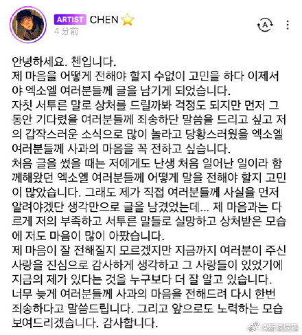 韓國大勢男團「EXO」曾唱紅多首歌曲,以獨特的魅力圈粉無數的他們,在亞洲擁有大批粉絲,不過成員「Chen」上月13日時,突然無預警透過粉絲團宣布結婚,隨後更公布了女方懷孕的消息,震驚大批粉絲,接著又爆出一連串廠商不續約、女方曬恩愛、粉絲要求退團等等爭議,他沉默了一個多月後,終於再度現身社群平台發長文,向粉絲道歉。