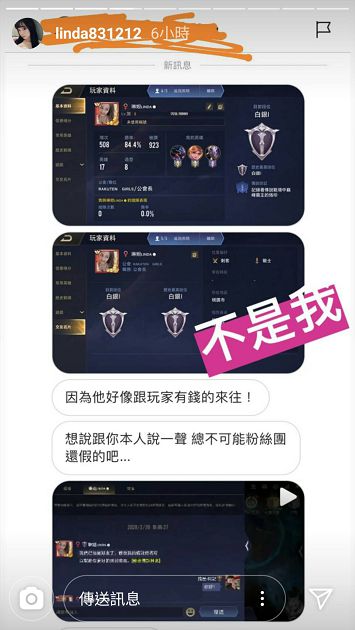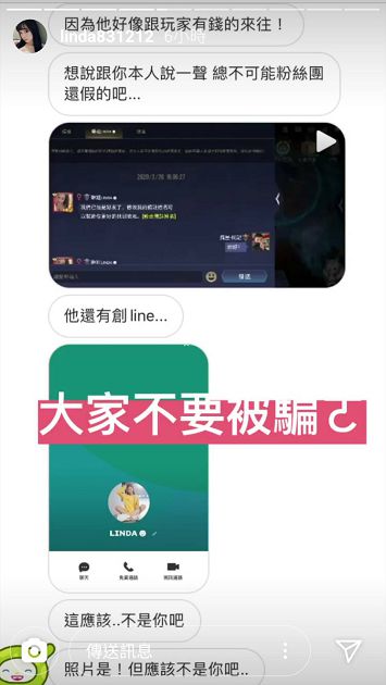 日前,她在IG限時動態上PO出網友私訊她的留言,該名網友先是貼出了一張疑似手機遊戲的畫面,仔細一看驚見畫面中的玩家不只使用琳妲的照片與名字作為個人資料,網友更指出「他好像跟玩家有錢的來往!」、「想說跟你本人說一聲,總不可能粉絲團還假的吧…」,除此之外,畫面中的玩家還另創line群,讓這名私訊琳妲的網友困惑不已,再次確認「這應該…不是你吧」,表示雖然照片是本人,但真實身分不可能是琳妲本人,對此,她在限時動態上慎重澄清「不是我,大家不要被騙喔」。