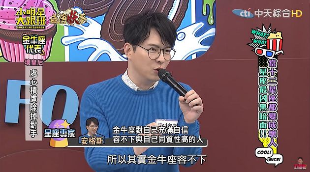 最近《小明星大跟班》以「當12星座都變成壞人?星座最凶最黑暗面!」為主題,邀請了許多藝人來賓來跟大家分享自己腹黑的一面,其中12星座裡的金牛座被專家安格斯指出會「處心積慮除掉敵人」,並解釋,「金牛座認為自己是最優秀的,眼裡容不下跟他相同性質、專長的人,只要處於競爭狀態,金牛就會設法讓對方滾!」