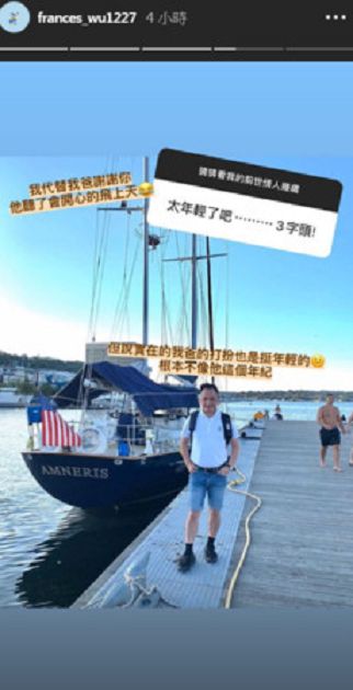 而坐在她身旁摟著她的肩膀的男人,正是她的爸爸,在照片裡可以看到,她爸爸身穿白色襯衫跟牛仔褲,看起來非常年輕,在另外的照片中也是穿著白色POLO衫跟牛仔短褲,完全看不出來這是爸爸會有的模樣!有網友猜她爸爸差不多「3字頭」,讓她笑說「代替我爸謝謝你,我爸打扮也是挺年輕的,根本不像他這個年紀」。