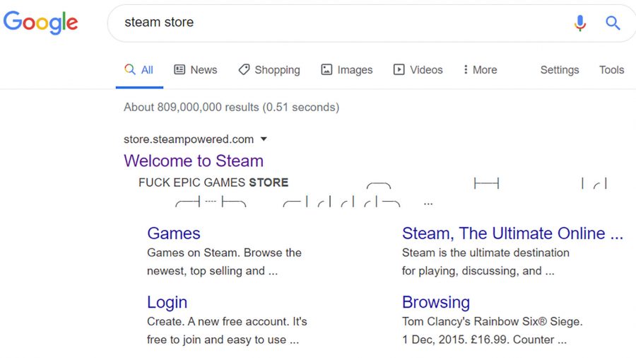 據外媒《PCGamesN》報導,有網友透過Google引擎搜尋「Steam Store」時,第一欄便出現了玩家們相當熟悉的Steam商店連結,不過卻有眼尖網友發現下方的簡介竟出現了「Fuck Epic Games Store」字樣。這件事被發現後,另一家外媒《Vg24/7 》也親自實測,發現結果完全一模一樣,不過如今,Google已經修正了這段文字簡介。