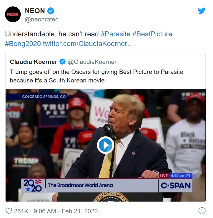《寄生上流》成為第一部拿下奧斯卡最佳影片的外語電影後,引起全球熱議,不過根據《CNN》報導,川普在近日出席科羅拉多泉市(Colorado Springs)的造勢晚會發表演說時,突然表示「今年的奧斯卡金像獎到底有多爛?你看到沒?贏家是一部來自南韓的電影。這到底是怎麼回事?」他接著說,「我們和南韓在貿易方面已經發生夠多問題了,而他們還把今年的最佳影片頒給他們(南韓)。這部電影好不好?我不知道。」隨後更表示最佳影片應該是經典電影,同時舉例《亂世佳人》(Gone with the Wind)、《日落大道》(Sunset Boulevard)等片。