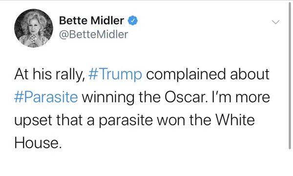 川普的言論再次在全球掀起熱議,對此《寄生上流》的美國發行公司「NEON」豪不客氣在推特上反擊:「可以理解,畢竟他毫不識字。」,而76歲的美國女星「貝蒂蜜勒」(Bette Midler)則以寄生上流的英文片名「寄生蟲」(Parasite)挖苦,「川普抱怨《寄生上流》贏了奧斯卡,我更不爽有隻寄生蟲贏了白宮。」CNN更表示,亂世佳人發行到現在都已經要80年了,但這恐怕是川普唯一知道的美國電影。