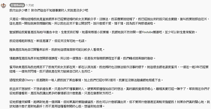 Bump在留言處針對網友提出的疑點,一一做出回覆,包括對方隆胸、上情趣課程等背後其實都有原因,至於蜜月缺席的部分,Bump則承認是因為受不了前女友天天以淚洗面,自己無法裝作沒事和老婆度蜜月才沒去,認了自己是在自毀人生。另外Bump也提供自己的視角,他表示自己愛過Cherry,但聽說了某些事情,加上吵架吵了2個月,實在無法過下去才選擇離婚,「如果你們真的關心她,就該知道什麼才是對她最好!而不是用這種看熱鬧的心態,想逼到她自爆」。