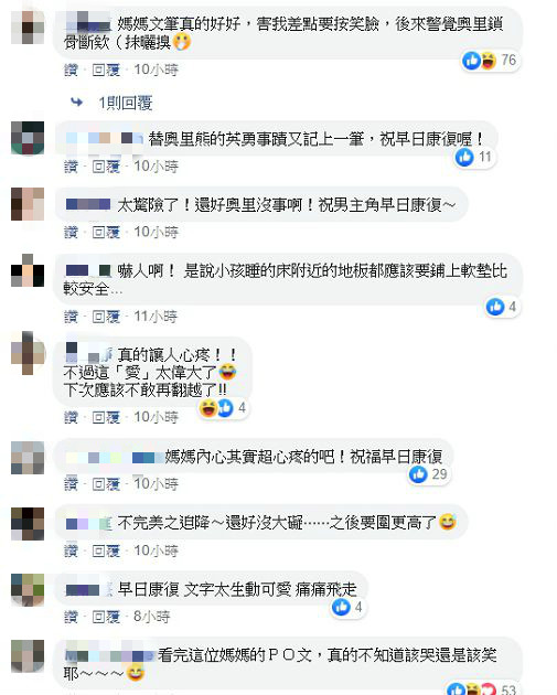 消息曝光引來不少網友關心,「太驚險了!還好奧里沒事啊!祝男主角早日康復~」、「嚇人啊!是說小孩睡的床附近的地板都應該要鋪上軟墊比較安全」、「媽媽內心其實超級心疼的吧!祝早日康復」、「不完美之迫降~還好沒大礙…之後要圍更高了」,同時也有網友被隋棠的文字逗樂,表示「媽媽文筆真的好好,害我差點要按笑臉,後來警覺奧里鎖骨斷欸」、「看完這位媽媽的PO文,真的不知道該哭還是該笑耶~」。