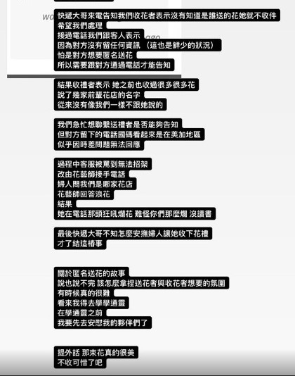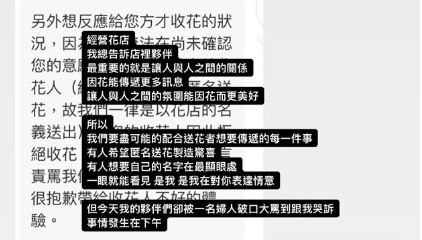 她接著表示某天下午,花店突然接到快遞大哥的來電告知,收件的婦人強調「沒有知道是誰送的花她就不收件」,想要知道寄件者的資料,但因寄件者並未留下資訊,怕是想匿名送花,所以必須先電話聯繫寄件者才能向婦人透露訊息,不料花店店員這番回應瞬間惹怒婦人,在電話另一頭大罵從來沒有遇過這樣的事,還將店名「浪花」錯聽成「爛花」,狂吼「爛花?難怪你們那麼爛!沒讀書」,硬生生將陳艾琳的員工罵到無法招架,當場哭了出來。