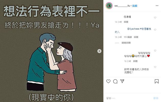謝和弦最近轉發了一則「女森」插畫家所創作的圖文,從插畫內容中可以得知,這則創作是以「現實中的你」跟「網路上的你」來呈現出兩者的對比,在現實中的人,搶走了別人的男友,還很開心;而網路中的人,則是變成了正義魔人,最討厭小三搶他人男友!