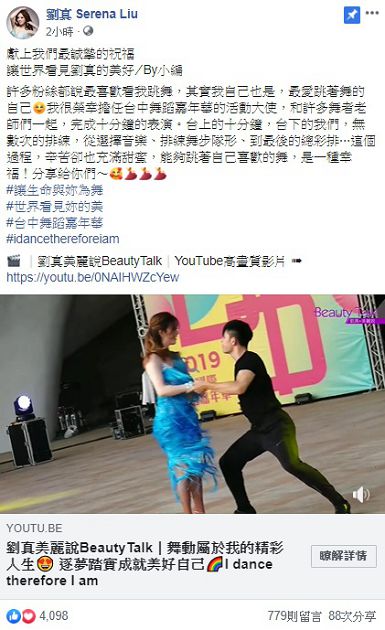 劉真的粉絲專頁突然在26日PO出了新的貼文,讓許多粉絲都驚訝不已!從貼文中可以看到,劉真提到,「許多粉絲都說最喜歡看我跳舞,其實我自己也是,最愛跳著舞的自己!」並且跟大家分享自己這一次擔任台中舞蹈嘉年華的活動大使,和許多舞者老師們一起,完成了十分鐘的表演!
