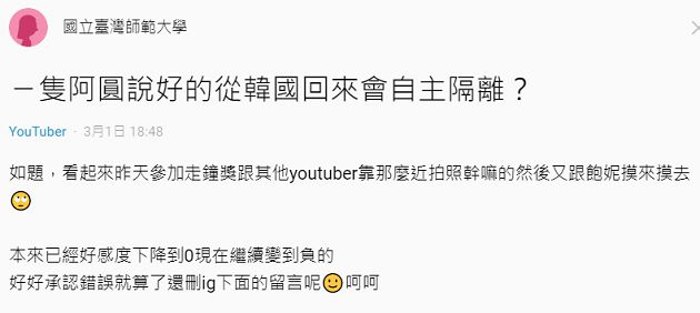 有網友在Dcard上指出,阿圓回國後曾在粉專提到「自主管理中」,沒想到卻立刻自打臉,不但上直播節目,甚至出席29號的「走鐘獎」典禮,且明顯未配戴口罩。此行為讓不少網友怒批根本就是「防疫漏洞」,瞬間在Dcard上罵聲一片!