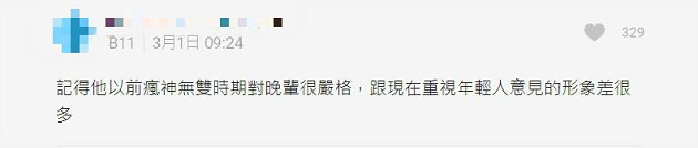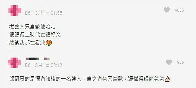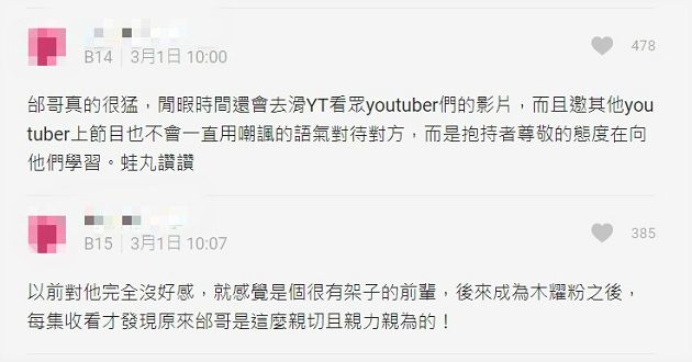 同時,也有幾位網友抱持著不同意見,「記得他以前瘋神無雙時期對晚輩很嚴格,跟現在重視年輕人意見的形象差很多」、「邰哥嗎…不好說各半吧,看一日系列有時候覺的不太尊重專業」,另外也有網友延伸討論,「反觀某憲」、「之前中國陷的節目為了拉收視率請了一堆請了一堆YouTuber上節目,結果對他們有夠沒禮貌」。這篇貼文掀起Dcard網友熱議後成為熱門貼文,吸引破萬位網友按讚,話題熱度居高不下。