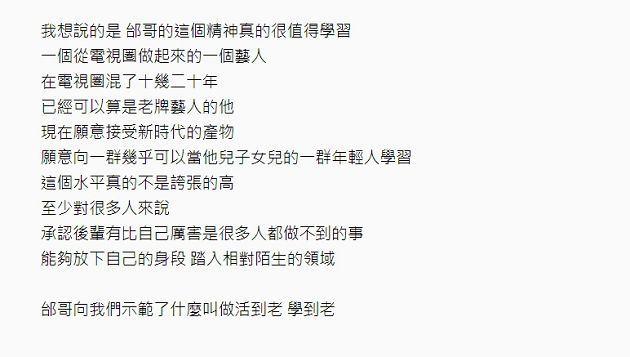 日前,有網友在Dcard上以「邰哥真的值得尊敬」為標題發文,表示看到了邰哥在IG上透露「台下這些人都是台灣新媒體創作的佼佼者,我尊敬他們,同時也要向他們虛心的學習。」,這番言論感動原PO,直呼邰哥「在電視圈混了十幾二十年、已經可以算是老牌藝人的他」,願意接受改變和虛心向年輕人學習真的很不容易,「至少對很多人來說,承認後輩有自己厲害是很多人都做不到的事」,最後感性表示「邰哥向我們示範了什麼叫做活到老、學到老」!