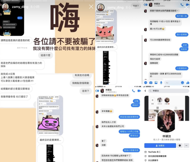 日前奎丁更新限時動態,一連曬出許多張截圖,只見其中有人冒用奎丁的名義,私訊未滿18的年輕女孩,以尋找有潛力的妹妹為由,要求對方完成「唱歌跳舞」等任務,完成後就會送上iPhone11、LV包包當獎勵,藉此來吸引女孩上鉤,而最終目的其實是為了裸照!