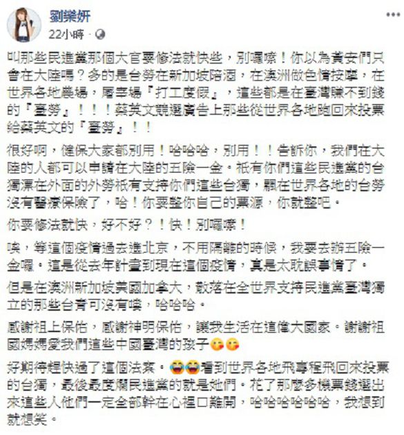 劉樂妍還接著酸說,「很好啊~健保大家都別用!告訴你,我們在大陸的人都可以申請在大陸的五險一金,只有你們這些支持民進黨的台獨、漂在外面的外勞沒有醫療保險了,哈!」還嘲笑這項修法是在整治票源,「要修就快!別囉嗦!」