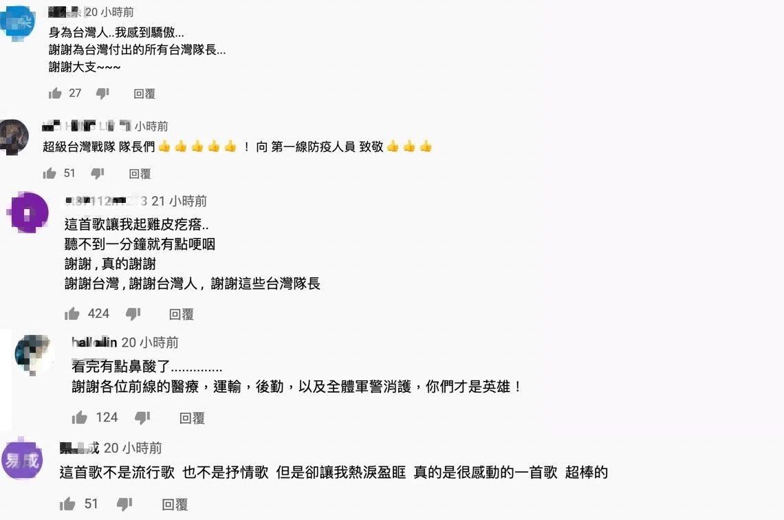 而當《台灣隊長Remix》一推出後,許多網友也感動得在留言區中說道:「也請各位台灣人配合防疫措施,祝福大家都能平平安安挺過這次外來病毒難關。聽完很感動也想到很多~感謝大支寫這首歌~」、「看完有點鼻酸了」、「這首歌讓我起雞皮疙瘩...聽不到一分鐘就有點哽咽」、「謝謝大支」,獲得許多好評。