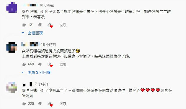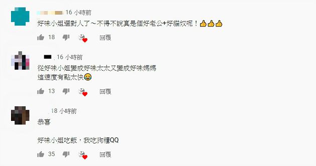 消息曝光後引來網友相繼祝福,直呼「既然好味小姐懷孕休息了就由好味先生來吧,快開個好味先生的單元吧,期待好味寶寶的到來,恭喜喔」、「突然從曬貓頻道變成放閃頻道了」、「關注好味小姐至少有三年了~恭喜好味媽媽」、「從結婚那集開始我就姨媽笑」、「聽到消息真的很開心和感動…」、「從好味小姐變成好味太太又變成好味媽媽,這速度有點太快」。