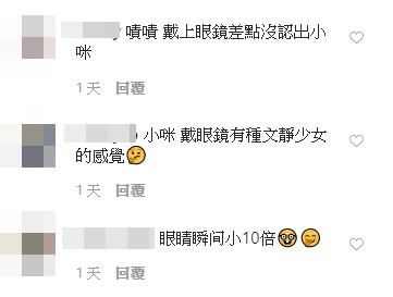 咪妃照片一出,立刻引來不少粉絲留言,除了稱讚以外,也有許多人表示,「雖然很正,但一時間不知道是誰咧」、「戴上眼鏡差點沒認出小咪」、「戴眼鏡有種文靜少女的感覺」、「眼睛瞬間小10倍」、「覺得素顏上街沒幾個會認出妳來」、「帶眼鏡真的會認不出來」、「不知道為什麼很不像咪妃」。