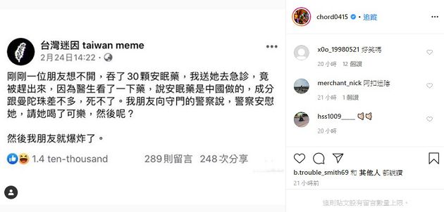 莉婭轉發狂吞「30顆安眠藥」反諷Keanna!謝和弦PO迷因遭網嗆:好笑嗎?
