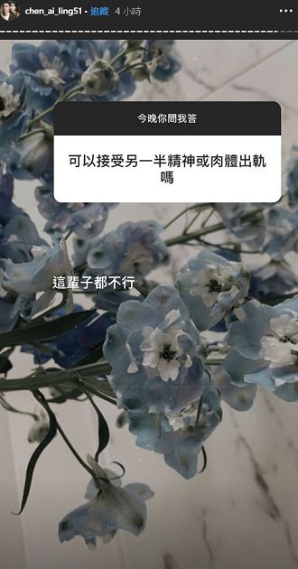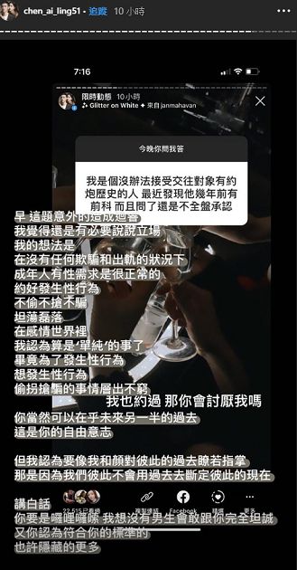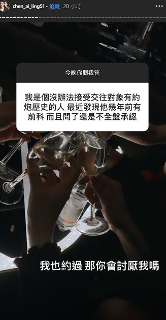 陳艾琳最近在限時動態上開放網友問答,沒想到有網友直接跟她抱怨說,「我是個沒辦法接受交往對象有約炮歷史的人,最近發現他幾年前有前科,而且問了還是不全盤承認!」不料,琳琳看了之後竟大方地回應說,「我也約過,那你會討厭我嗎?」
