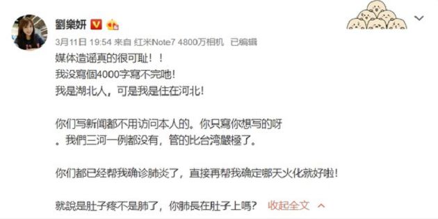 劉樂妍11日晚上在微博發文反駁她「接觸武漢肺炎患者」一說,並解釋說,「我是湖北人,可是我是住在河北!我們三河一例都沒有,管的比台灣嚴極了!」打臉那些說她有接觸患者的人,並且豪不客氣地怒嗆,「你們都已經幫我確診肺炎了,直接再幫我確定哪天火化就好啦!都說是肚子疼不是肺了,你肺長在肚子上嗎?」