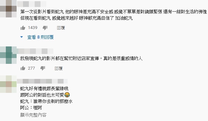 雖然蛇丸的一天,有許多地方不一樣了,但是在蛇丸的生活中,有許多東西仍然不變,像是早上吃的飯糰、幫阿公買午餐的孝心等,這點讓不少人相當感動,紛紛留言,「發現蛇丸的影片都在幫忙附近店家宣傳,真的是很重感情的人」、「看到這個影片真的蠻感動的,蛇丸不再待業,開始減肥,會自己剪片想腳本,看得出來你有在努力」、「看得出來狠愛演都在進步!」、「好感動ಠ_ಠ 終於不是待業了是一個專業YouTuber了」。