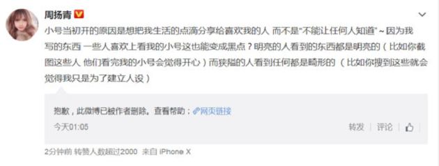 自從周揚青跟羅志祥爆出分手消息之後,有網友找到周揚青開的私人小帳,並指出她是為了建立更好的形象,才會開這些小帳!而周揚青也在13日發文解釋自己創辦小帳的原因,她表示,「當初開小帳,是想把生活點滴分享給喜歡我的人,而不是不能讓任何人知道!因為我寫的東西,一些人喜歡上看我的小號也能變成黑點?」