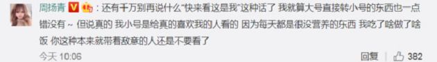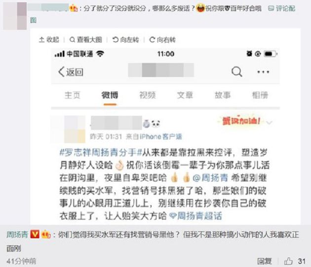 而周揚青最近也因為剛從東京回到北京,正在家中隔離,她也在微博上提到自己最近看到不少抹黑自己的發文,甚至還有酸民直接Tag她的帳號,讓她無奈的說,「不懂他圈我大號的勇氣!默默罵不就好了?」還有網友說她找人抹黑羅志祥,讓她氣憤的說,「你們覺得我買水軍還有找營銷號黑他?但我不是那種搞小動作的人!我喜歡正面剛!」