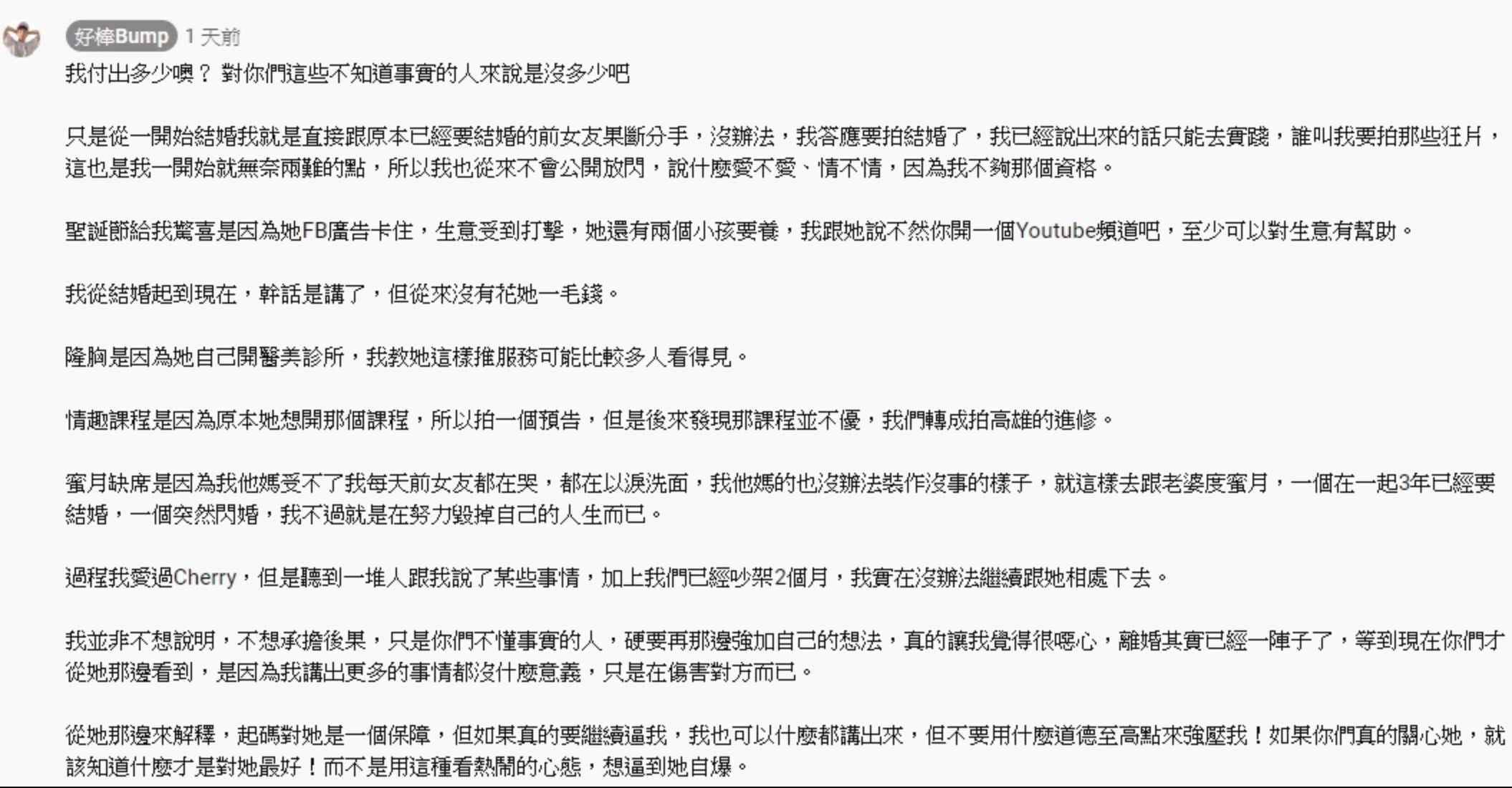 Cherry一公開離婚消息,不少網友便開始抨擊Bump,Bump也於影片留言處發表聲明,針對網友疑點,一一做出回覆,其中不但自爆和論及婚嫁的3年女友分手,還爆料前妻早就有兩個小孩。Cherry的隱私被公開,讓她感到十分不滿,卻仍希望事件到此落幕,各自向前走。