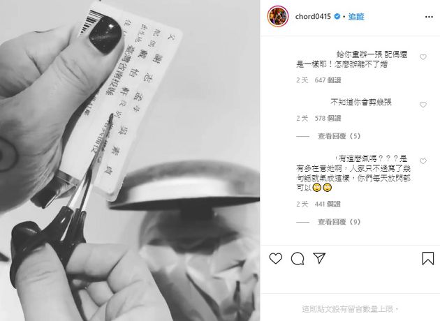 從畫面中可以看到,謝和弦拿著剪刀一刀一刀的剪掉身分證,這也同時向大家表示著,他跟Keanna的關係已經是「一刀兩斷」!讓不少網友看了都紛紛留言說,「你重辦一張配偶還是一樣耶!怎麼辦,離不了婚~」、「不知道你會剪幾張」、「有這麼氣嗎?是有多在意她啊?」、「這麼晚了還在作美勞唷?」、「怎麼不剪自己的手」、「只有人過世才會剪身分證,所以有人要死掉了嗎?」。
