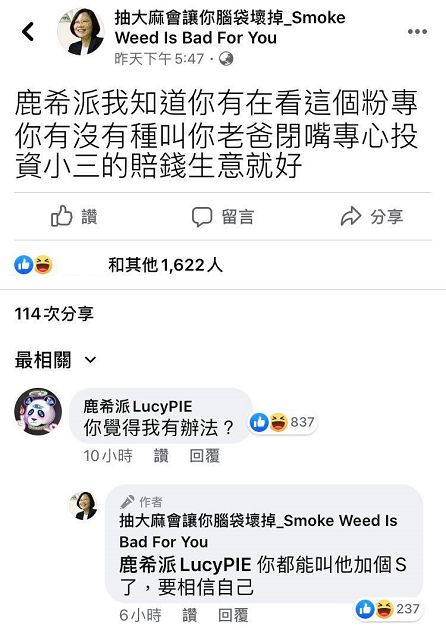 最近有一個叫做「抽大麻會讓你腦袋壞掉」的臉書粉專,在12日時發文寫道,「鹿希派我知道你有在看這個粉專,你有沒有種叫你老爸閉嘴專心投資小三的賠錢生意就好」。沒想到沒多久之後,鹿希派竟然真的出現來回應這則貼文,並且很霸氣的寫下,「你覺得我有辦法?」讓網友們頓時都驚訝不已!