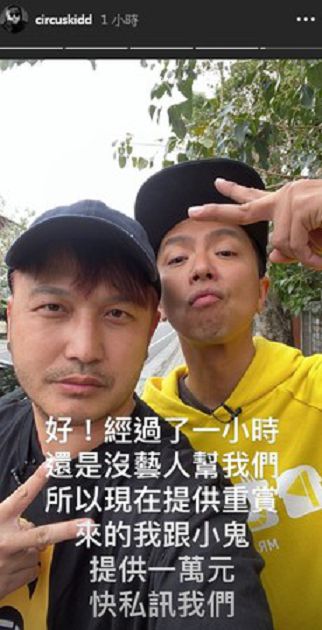 後來兩人也在回台北的途中在IG發文尋求協助,「有哪個藝人朋友剛好在南投草屯或是可以來南投草屯找我們一下的,私訊我唷!」沒想到過了一個小時依然沒有人來找他們,讓他們無奈地說,「來的我跟小鬼提供一萬元!」讓粉絲們看了都好嗨~