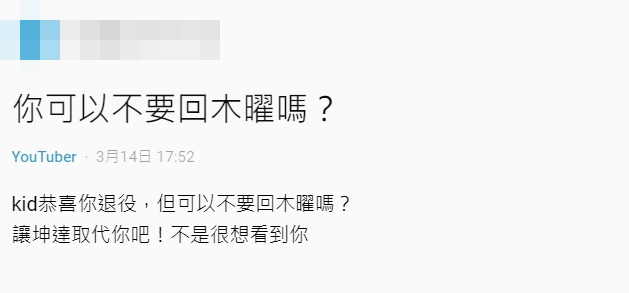 KID服役約一年的時間後,於這個月13號親自在臉書上宣布退伍,曬出退役證明書,結束替代役的身分。KID在入伍前是《木曜4超玩》的主持人,也因此退伍後是否會回歸?立刻成為網路熱門話題,日前有網友在Dcard發文,「恭喜你退役,但可以不要回木曜嗎?讓坤達取代你吧!不是很想看到你」,文章一出,立刻引來兩派論戰。