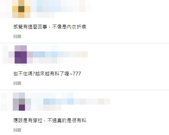 網友開啟話題後,立刻有不少人留言討論,「企鵝妹是傻妹個性~不意外拉」、「感覺有這麼回事,不像是內衣折痕」、「包不住嗎?越來越有料了~」、「應該是有穿拉,不過真的是很有料」、「看起來蠻有料的XDD」、「好像若隱若現的感覺」、「應該還好吧~感覺是沒很明顯」、「有變大!」。