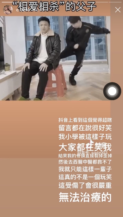 青青經常在社群平台分享生活,日前她貼出一段抖音短片,只見影片中,一名男子坐在椅子上,隨後另一名男性趁其不備,將椅子踢掉,使人摔落地面,開玩笑的畫面,讓不少人在影片下方留言直呼「好笑」。然而這樣的影片雖然有人認為只是玩笑,但青青卻曾因這樣的舉動,留下一輩子的傷口。